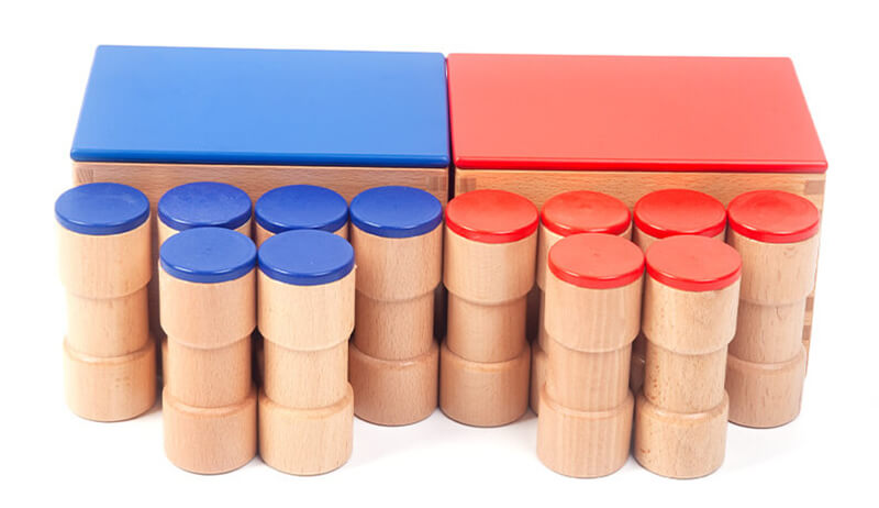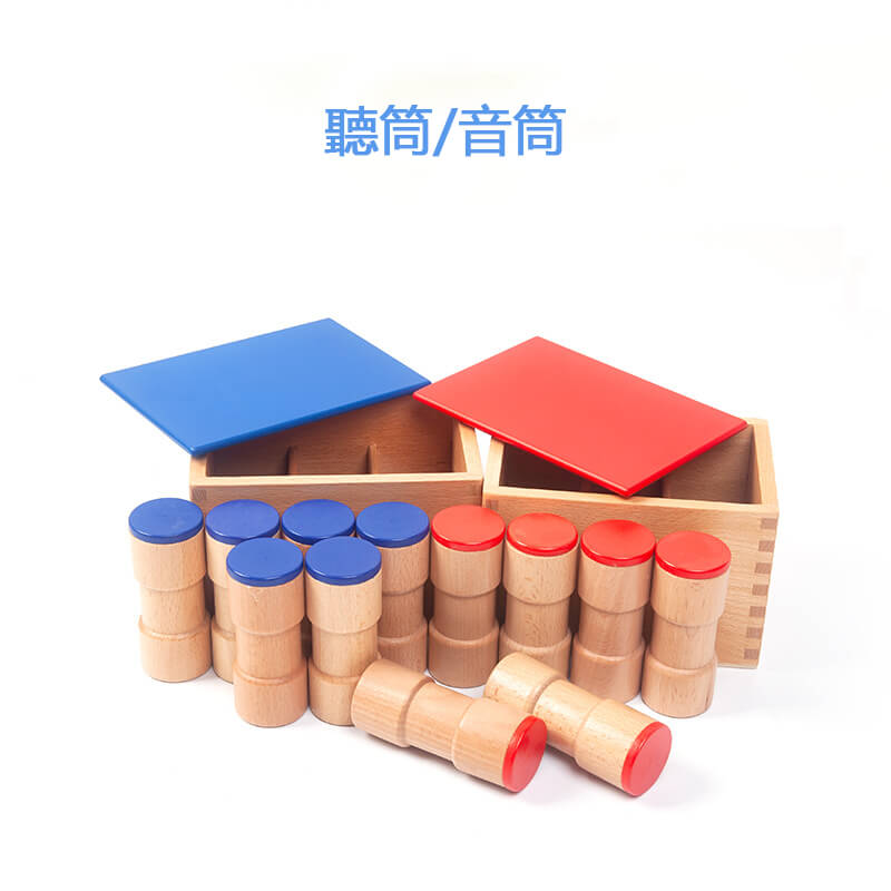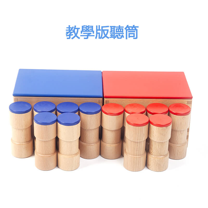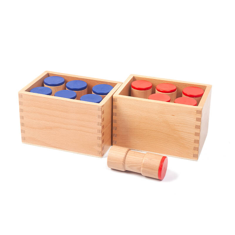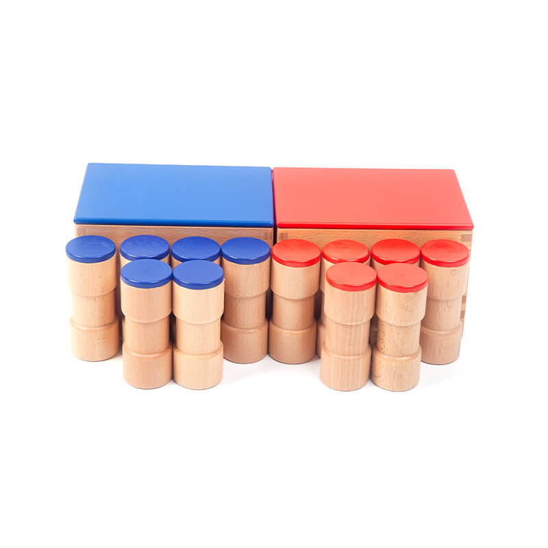 在兩個木箱中,分別有紅、藍色兩組教具,每組各有6個木製圓筒,圓筒內裝有不同的材料(小石子、沙子、谷類、米粒、米糠等),搖動時能發出強弱程度不同的聲音。圓筒上有和木箱蓋相同的顏色,分成紅、藍兩組,每組中的6個圓筒各自成對,可以進行配對練習。