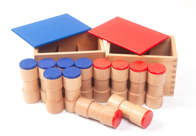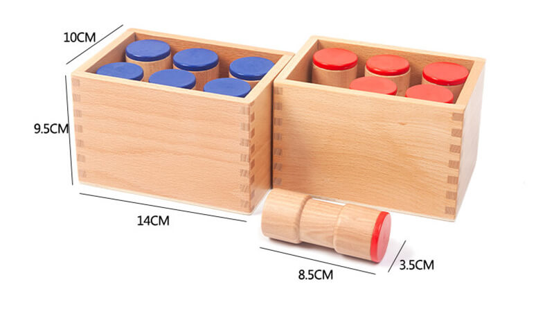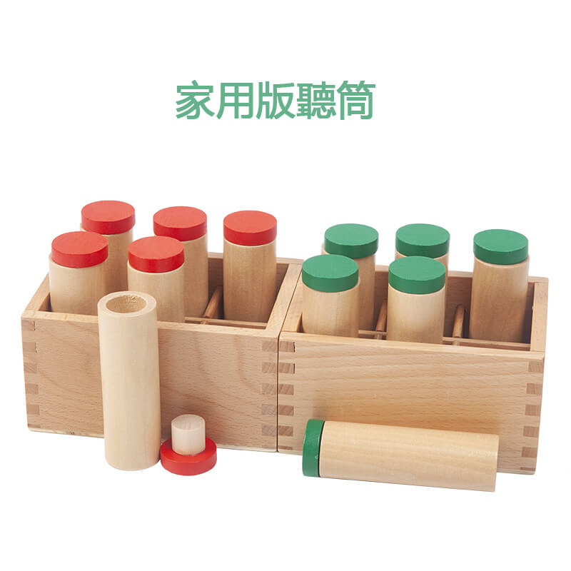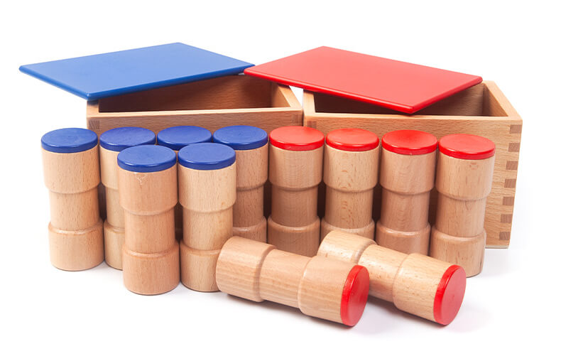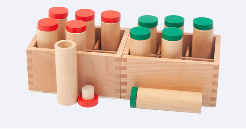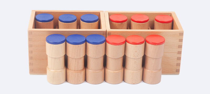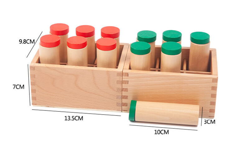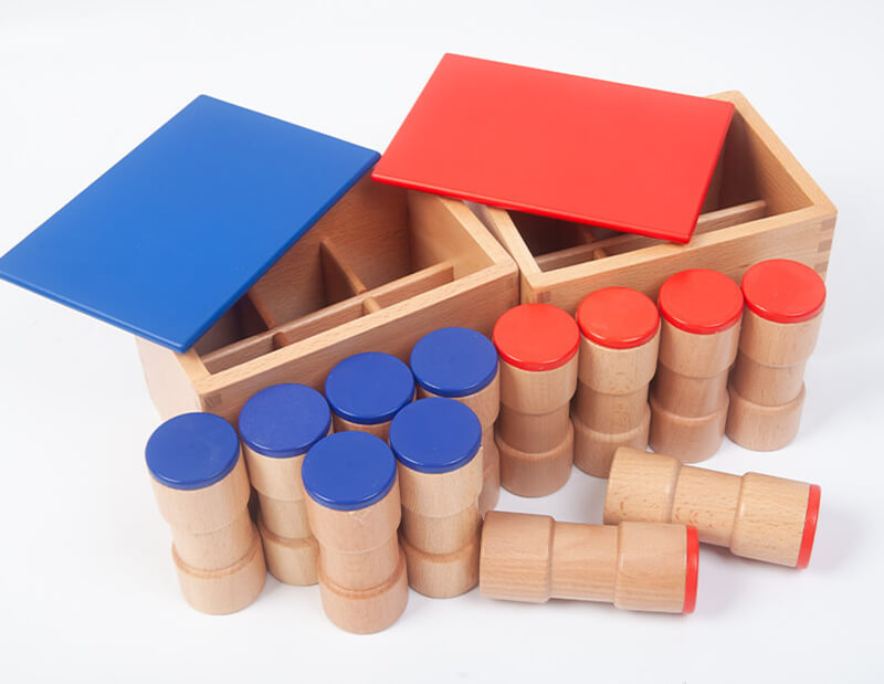 在兩個木箱中,分別有紅、藍色兩組教具,每組各有6個木製圓筒,圓筒內裝有不同的材料(小石子、沙子、谷類、米粒、米糠等),搖動時能發出強弱程度不同的聲音。圓筒上有和木箱蓋相同的顏色,分成紅、藍兩組,每組中的6個圓筒各自成對,可以進行配對練習。